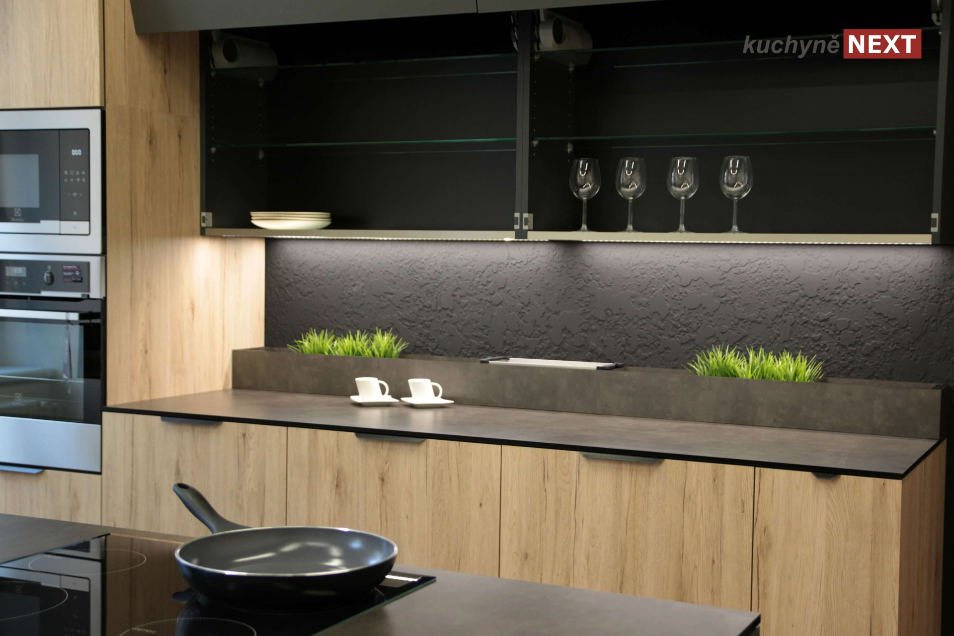 Luxusní kuchyně v šedém matu doplněná imitací světlého dubu s kompaktní pracovní deskou v tloušťce 12mm. Horní skříňky jsou vybaveny elektricky výklopným kováním BLUM Aventos HF a všechny zásuvky byly osazeny tradičně plnovýsuvy BLUM Tandembox Antaro v luxusním černém provedení. Sestava kuchyně je vybavena spotřebiči ELECTROLUX a zapuštěným nerezovým dřezem a masivní nerezovou baterií s dávkovačem CARESSI.